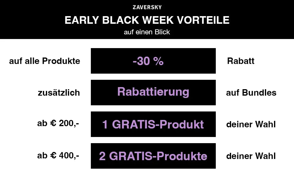 Sichern Sie sich jetzt in der ZAVERSKY Early Black Week bis zu 50 % Rabatt! Ihr Rabatt wird im Warenkorb berechnet.