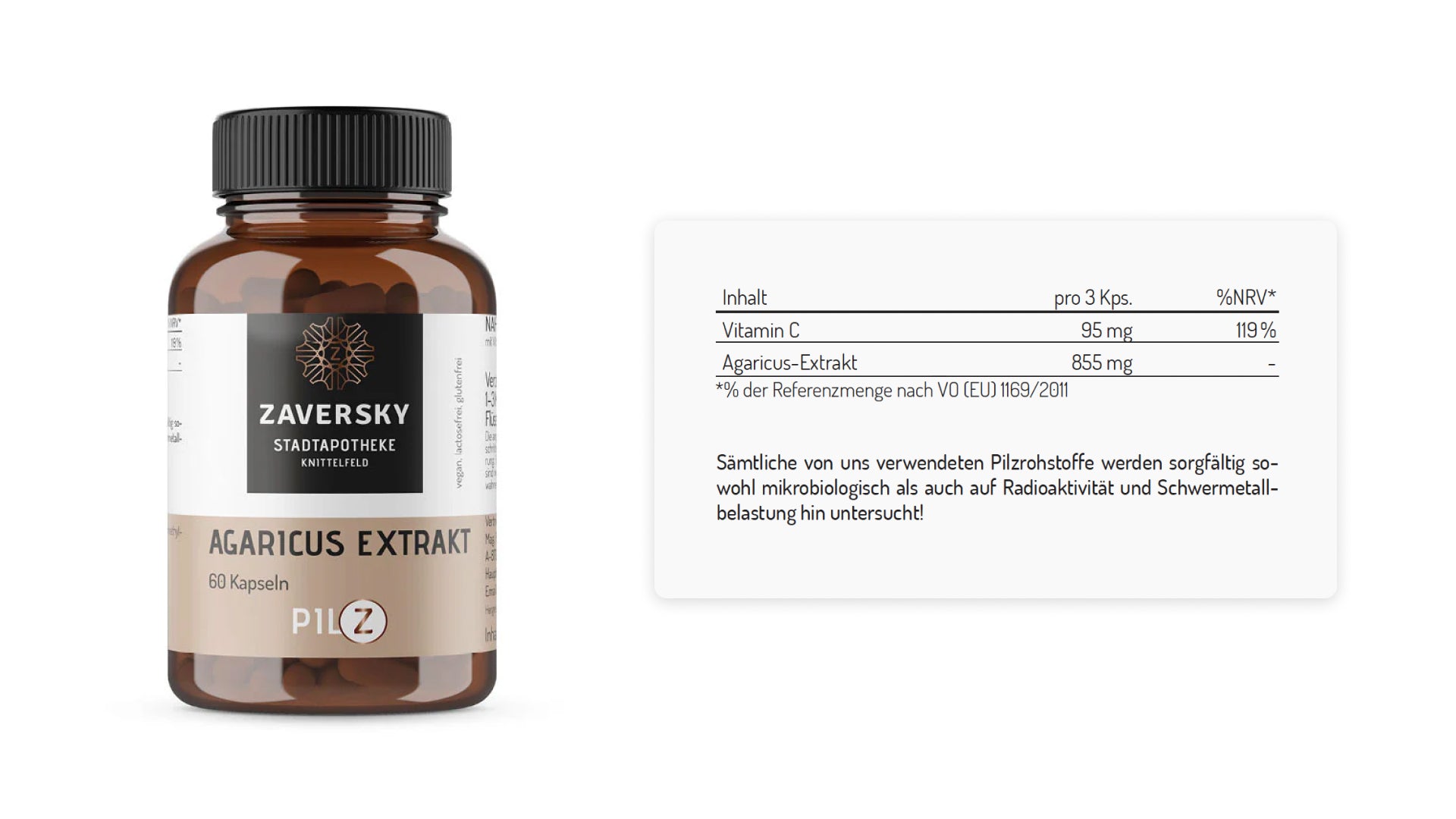 Zutaten: Agaricus-Extrakt (Agaricus brasiliensis), Hxdroxypropylmethylcellulose (Kapselhülle), Calcium-L-ascorbat/Threonat