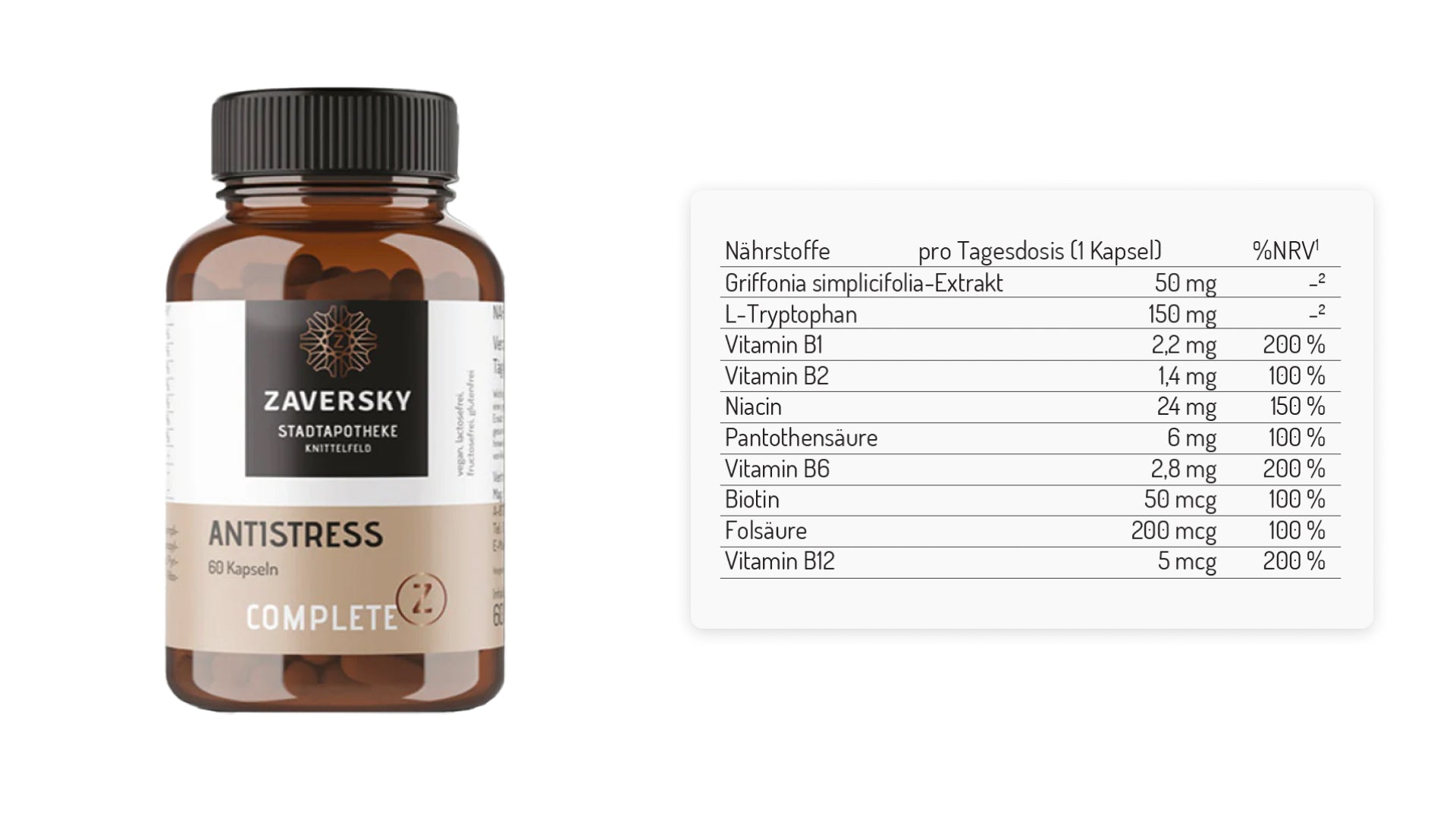 Zutaten: Afrikanischer Schwarzbohnen-Extrakt (Griffonia simplicifolia Extrakt [4:1]), L-Tryptophan, Überzugsmittel: Hydroxypropylmethylcellulose (pflanzliche Kapselhülle), Nicotinsäureamid, Calcium-D-pantothenat, Pyridoxinhydrochlorid, Thiaminhydrochlorid, Cyanocobalamin, Riboflavin, Pteroylmonoglutaminsäure (Folsäure).