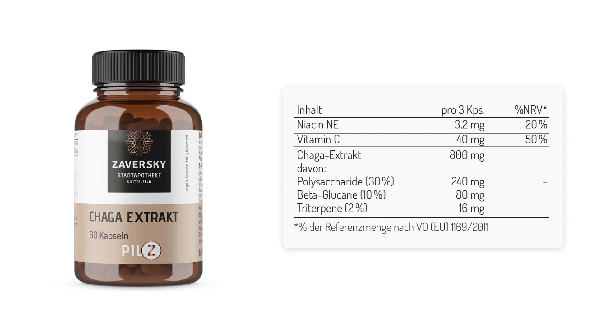 Für Chaga Extrakt verwenden wir einen speziellen, hochwertigen Pilzextrakt, der auf 30 % Polysaccharide, 10 % Beta-Glucane und 2 % Triterpene standardisiert ist. Das Produkt enthält neben dem hochwertigen Chaga-Extrakt auch Niacin zur Erhaltung normaler Haut und Schleimhäute wie beispielsweise auch der Magen- und Darmschleimhaut sowie Vitamin C (Ester-C®) zur normalen Funktion des Immunsystems und einem normalen Energiestoffwechsel.