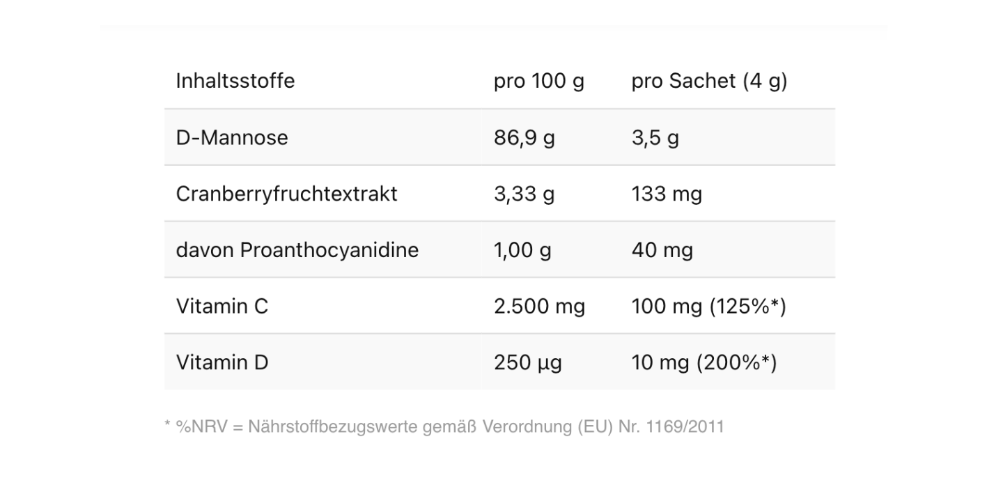 Zutaten: D-Mannose, Zitronensäure (Säuerungsmittel), Cranberryfruchtextrakt, L-Ascorbinsäure, Aroma, Sucralose (Süßungsmittel), Rote Beete Saftpulver, Cholecalciferol (vegetarisch)