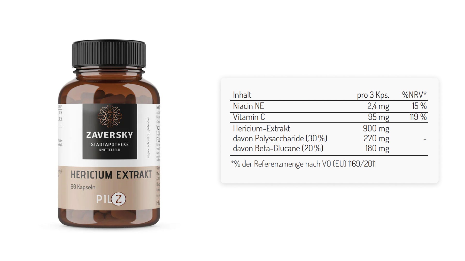Zutaten: Hericium -Extrakt (Hericium erinaceus)), Hxdroxypropylmethylcellulose (Kapselhülle), Calcium-L-ascorbat/Threonat; Niacinamid