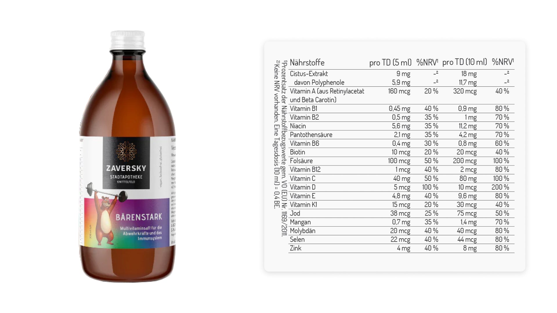 Der optimal abgestimmte Bärenstark Multivitaminsaft unterstützt mit dem polyphenolreichen Extrakt aus der Zistrose (Cistus incanus) und ausgewählten Mikronährstoffen aktiv das Immunsystem.