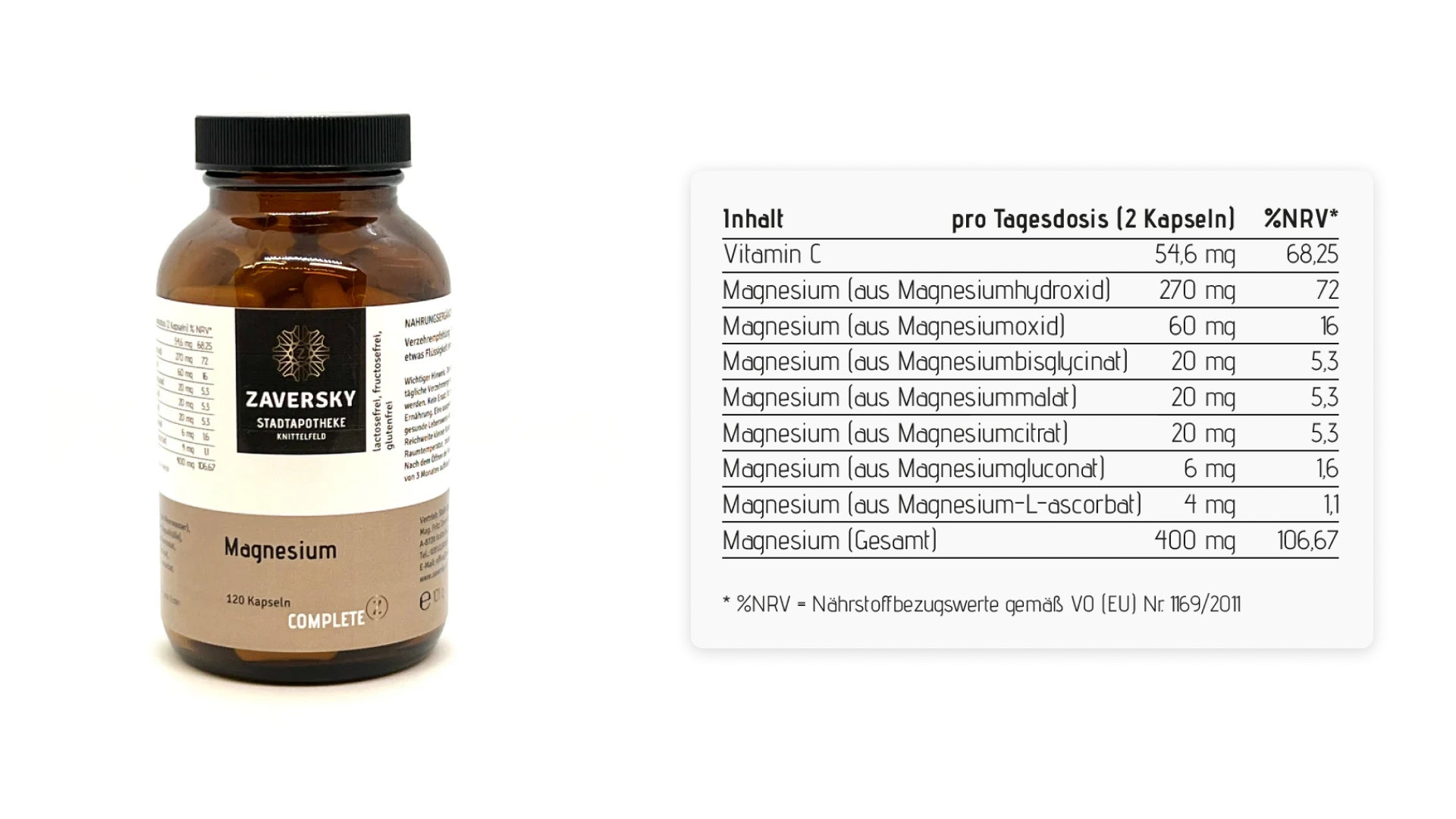 • Zutaten: Magnesiumhydroxid (aus dem Meerwasser), Hydroxypropylmethylcellulose (Kapselhülle), Magnesiumbisglycinat, Magnesiumalat, Magnesiumcitrat, Magnesiumgluconat, Magnesiumoxid, Magnesium-L-ascorbat
