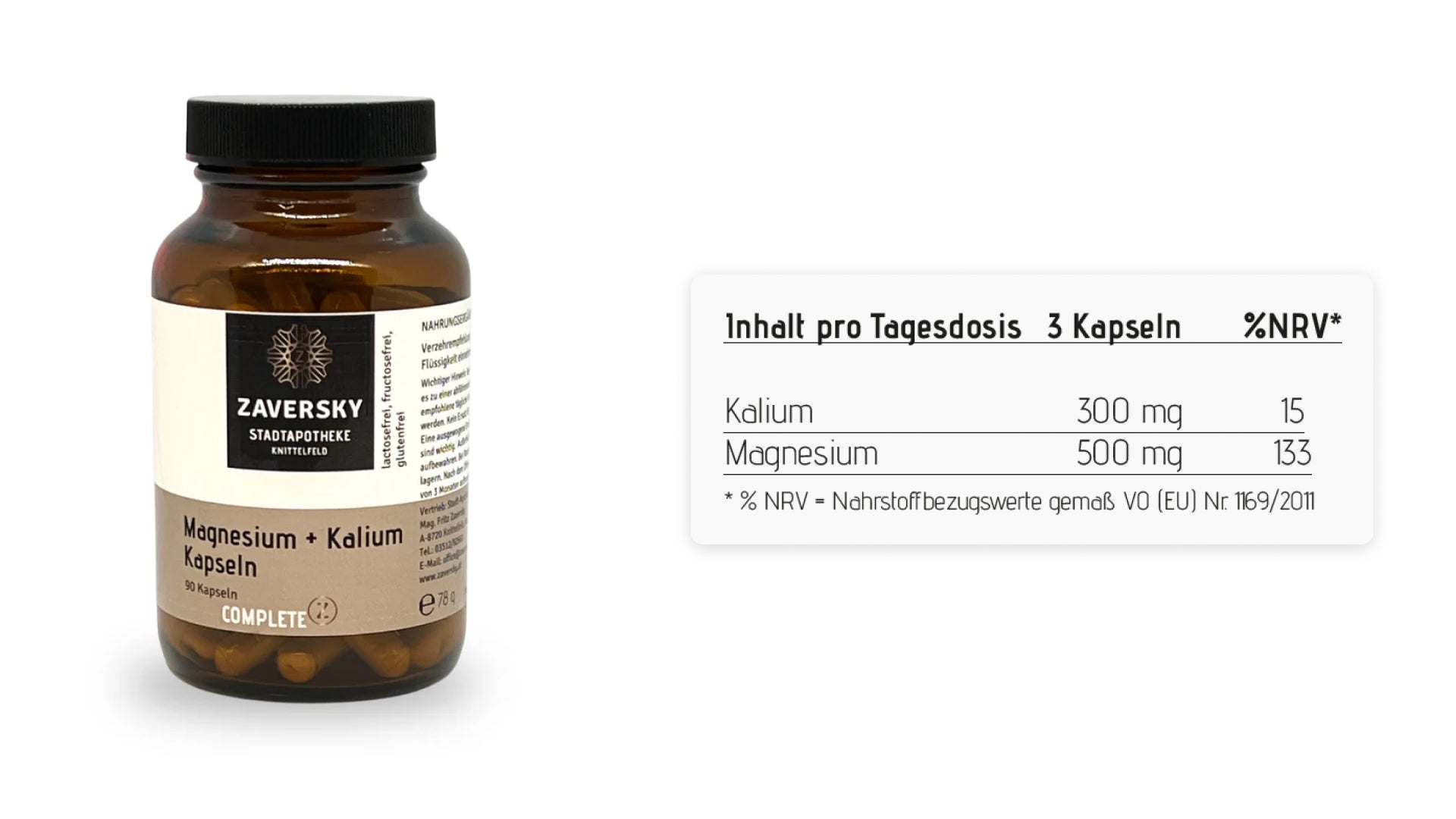 Magnesium und Kalium unterstützen in dieser Kombination unseres Ergänzungsmittels die normale Muskelfunktion und die normale Funktion des Nervensystems. Kalium trägt zudem zur Aufrechterhaltung eines normalen Blutdrucks bei. Magnesium leistet einen wichtigen Beitrag zum Elektrolytgleichgewicht sowie zur Erhaltung normaler Knochen