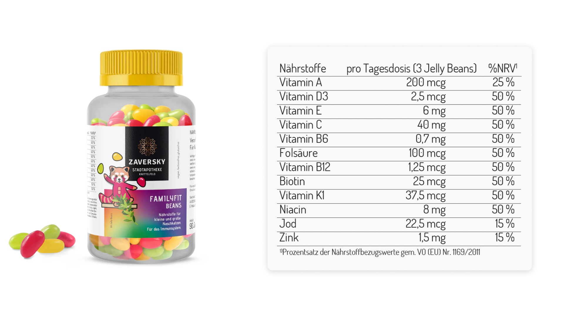 • 3 JellyBeans täglich für eine volle Ladung Vitamine+Zink und Jod