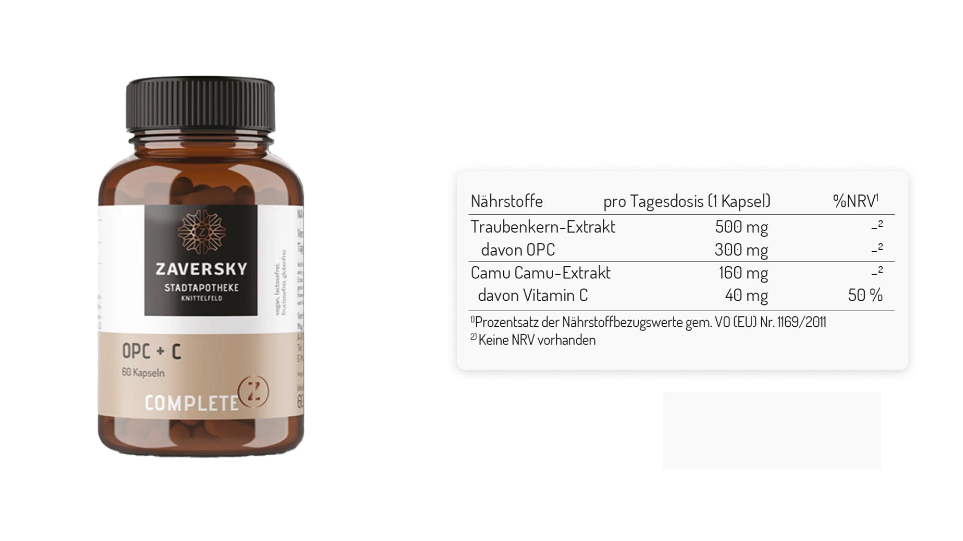 • OPC + Vitamin C enthält 300 mg OPC, einen Extrakt aus Traubenkernen.