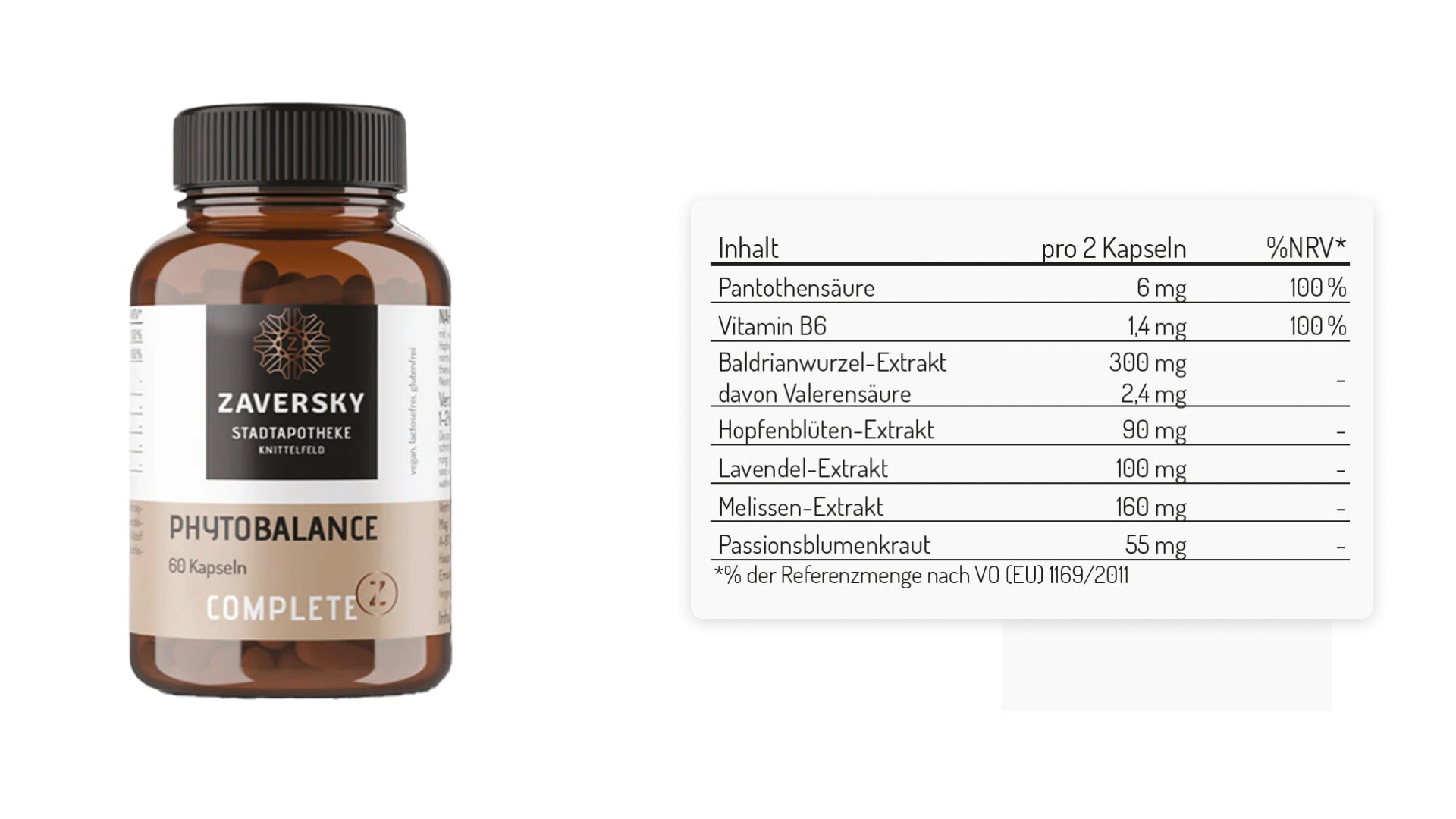 Zutaten: Baldrianwurzelextrakt (0,8% Valerensäure), Hydroxypropylmethylcellulose (Kapselhülle), Melissen-Extrakt, Lavendel-Extrakt, Hopfenblüten-Extrakt, Passionsblumenkraut Pulver, Füllstoff: Cellulose, Maltodextrin, Calcium-D-pantothenat, Pyridoxinhydrochlorid