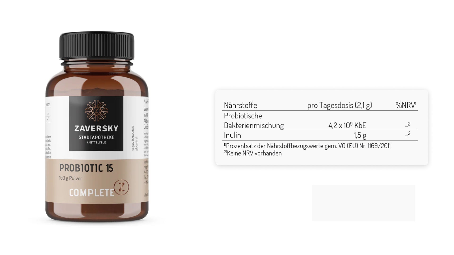 Unser 3,5 jähriger Sohn hatte massive Probleme mit der Verdauung. Von der Kinderärztin wurde ein Abführmittel verordnet, womit er aber noch mehr über Bauchweh klagte. Mit dem Probiotic Pulver von Zaversky war das Bauchweh innerhalb von wenigen Tagen weg und der Stuhlgang kam wieder regelmäßig. Wir sind total froh und happy, dass wir das Pulver empfohlen bekommen haben. Zusätzlich hat uns die Apotheke noch Bauchweh-Tropferl zusammen gemischt, die akut helfen. Die Beratung war top, die Lieferung war am nächsten Tag schon bei uns und die Produkte sind von spitzen Qualität. Wir sind total überzeugt und kaufen gerne wieder!