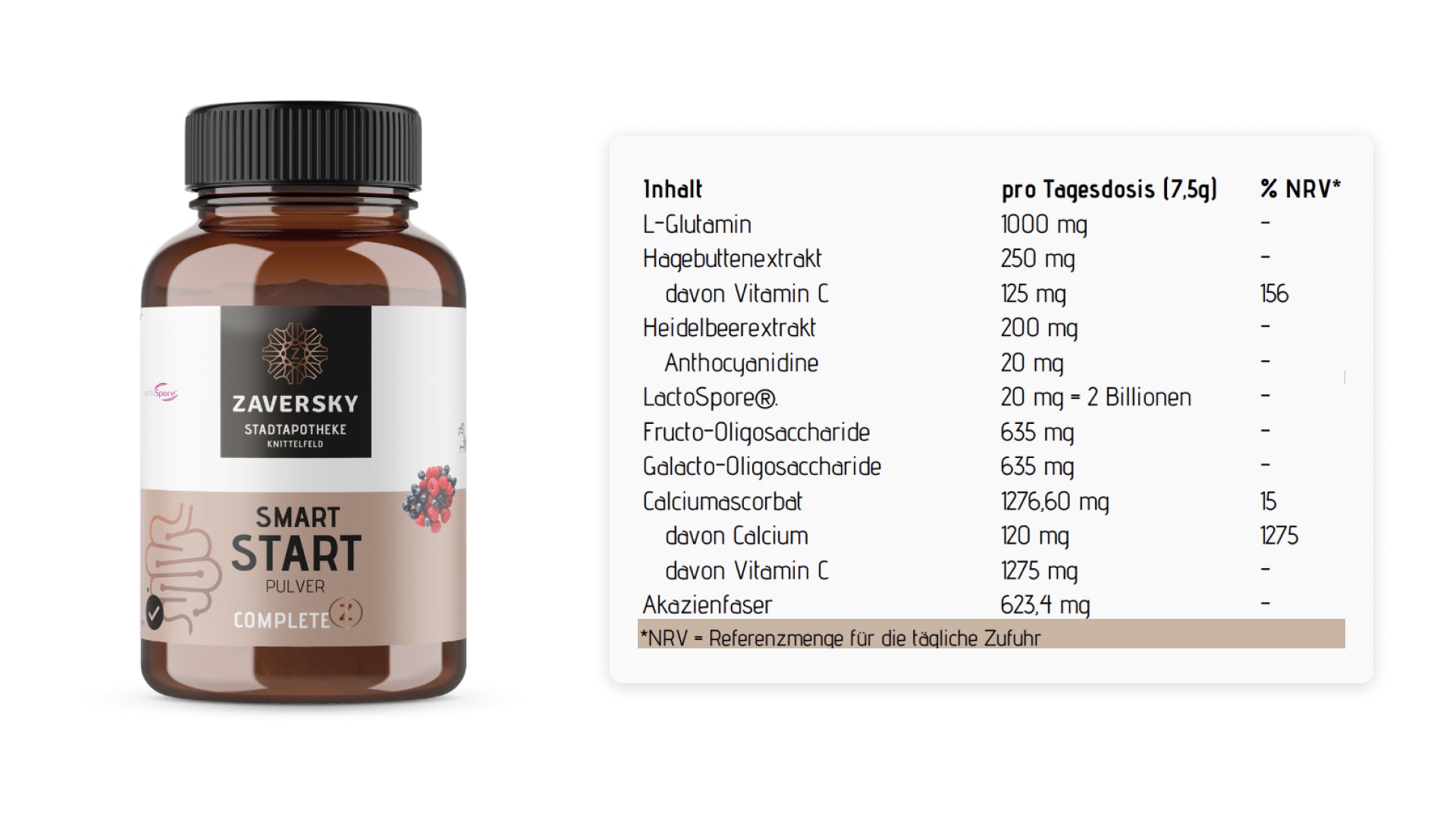 SmartSTART ist ein innovativer Expertenkomplex mit einem umfassenden Ballaststoffmix, der Aminosäure L-Glutamin, wertvollen Pflanzenextrakten und einer einzigartigen Quelle an guten Bakterien: LactoSpore®