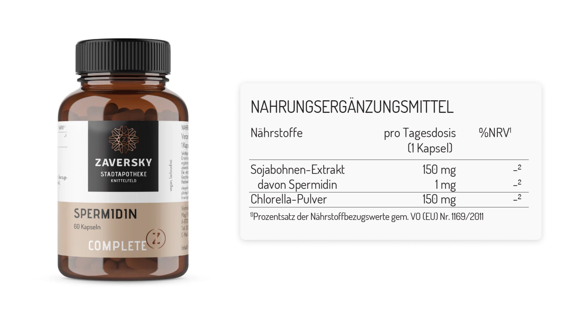 Für Sie haben wir gleich zwei wertvolle Quellen für Spermidin kombiniert: Sojabohnen-Extrakt und Chlorella-Pulver!