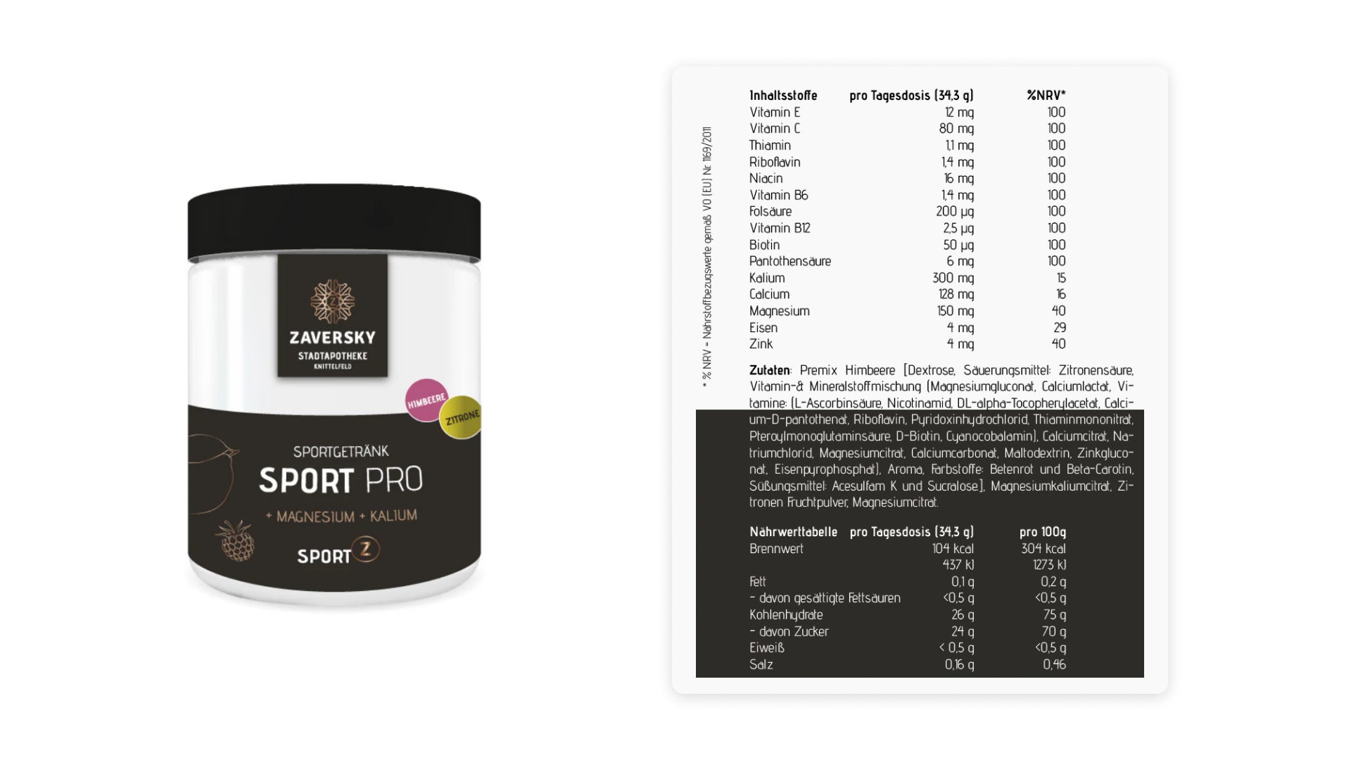 Zutaten: Dextrose, Kaliumcitrat, Magnesiumgluconat, Calciumlactat, Calciumcitrat, Magnesiumcitrat, Calciumcarbonat, Maltodextrin, Natriumchlorid, Zinkgluconat, Eisenpyrophosphat, L-Ascorbinsäure, DL-alpha-Tocopherolacetat, Nicotinamid, Calcium-D-pantothenat, Thiaminmononitrat, Riboflavin, Pyridoxinhydrochlorid, Cyanocobalamin, Pteroylmonoglutaminsäure, D-Biotin, Zitronenfruchtpulver, Aroma, Säuerungsmittel: Zitronensäure, Farbstoff: Betenrot, Beta-Carotin, Süßungsmittel: Acesulfam K und Sucralose
