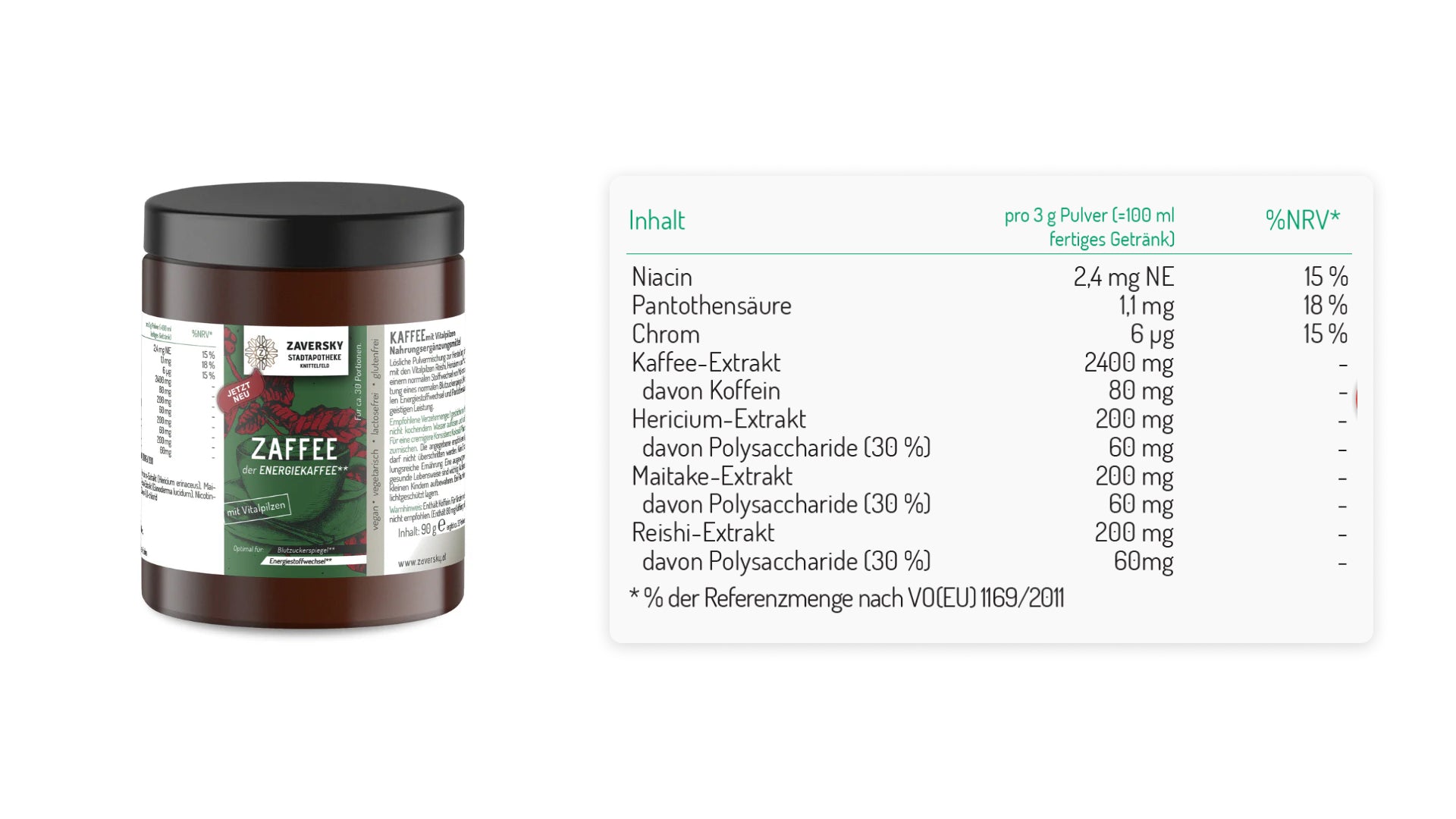 Zutaten: Kaffee-Extrakt löslich, Hericium-Extrakt (Hericium erinaceus), Maitake-Extrakt (Grifolia frondosa), Reishi-Extrakt (Ganoderma lucidum), Nicotinamid, Calcium-D-pantothenat, Chrom-(III)-chlorid