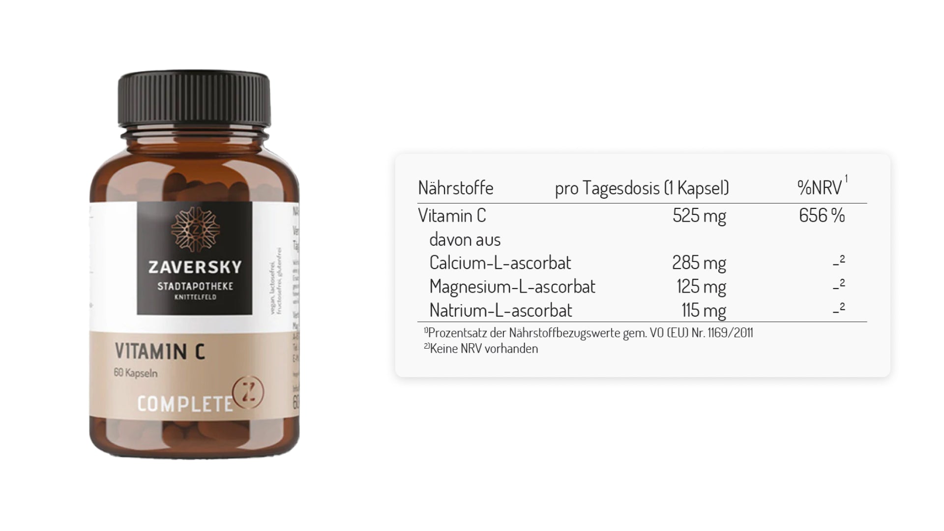 Zutaten: Calcium-L-ascorbat, Magnesium-L-ascorbat, Natrium-L-ascorbat, Überzugsmittel: Hydroxypropylmethylcellulose (pflanzliche Kapselhülle).